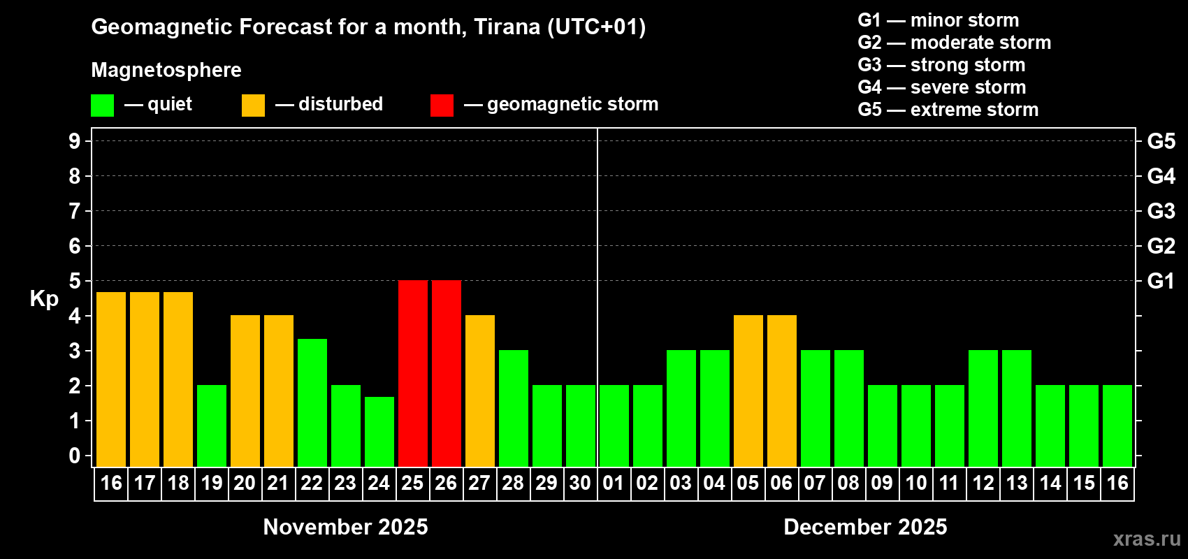 Geomagnetic storm forecast in Tirana for Nov 16, 2025