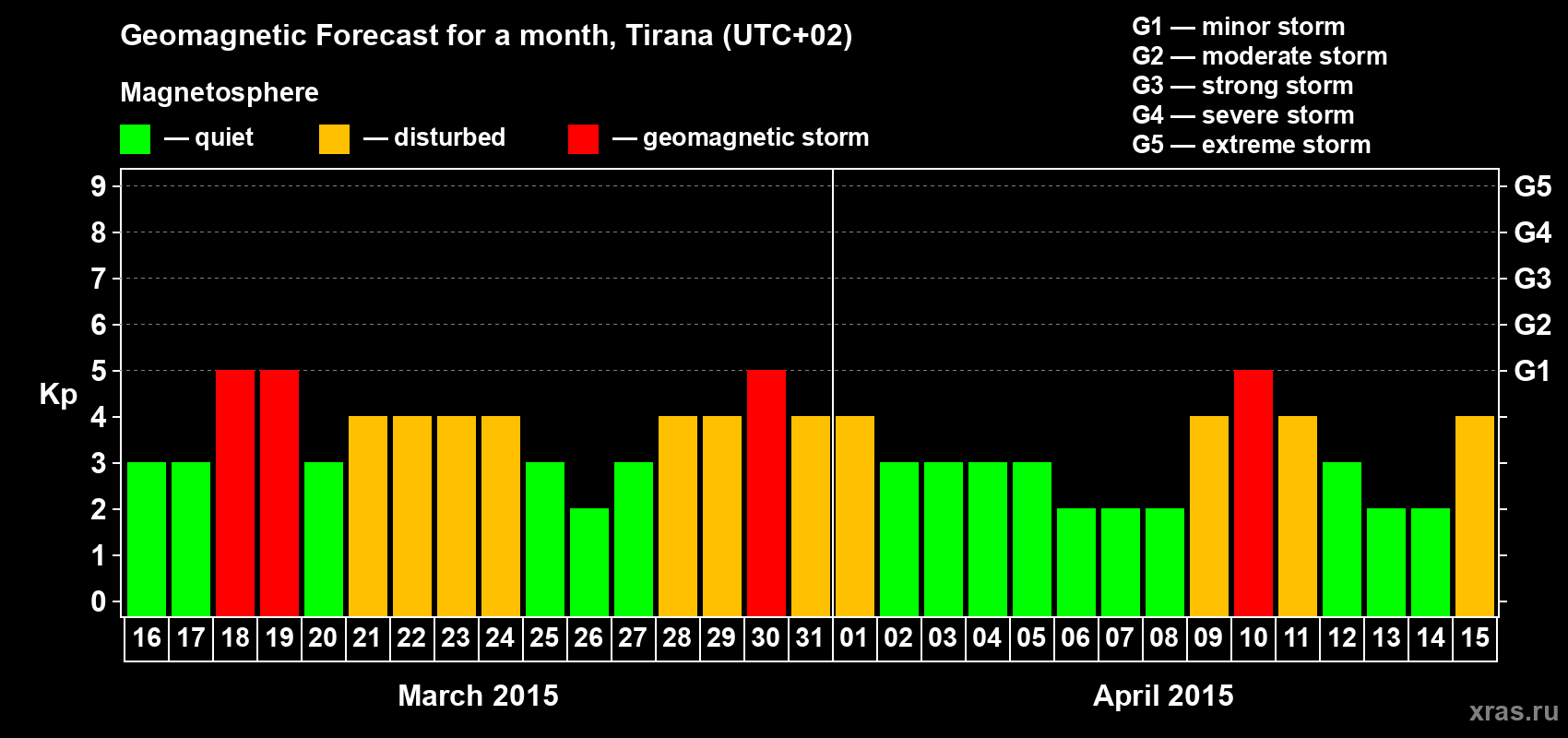Geomagnetic storm forecast in Tirana for Mar 16, 2015
