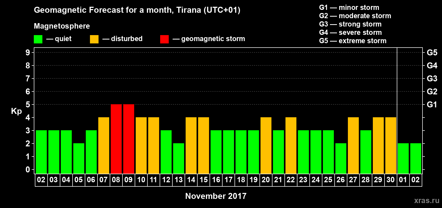 Geomagnetic storm forecast in Tirana for Nov 02, 2017
