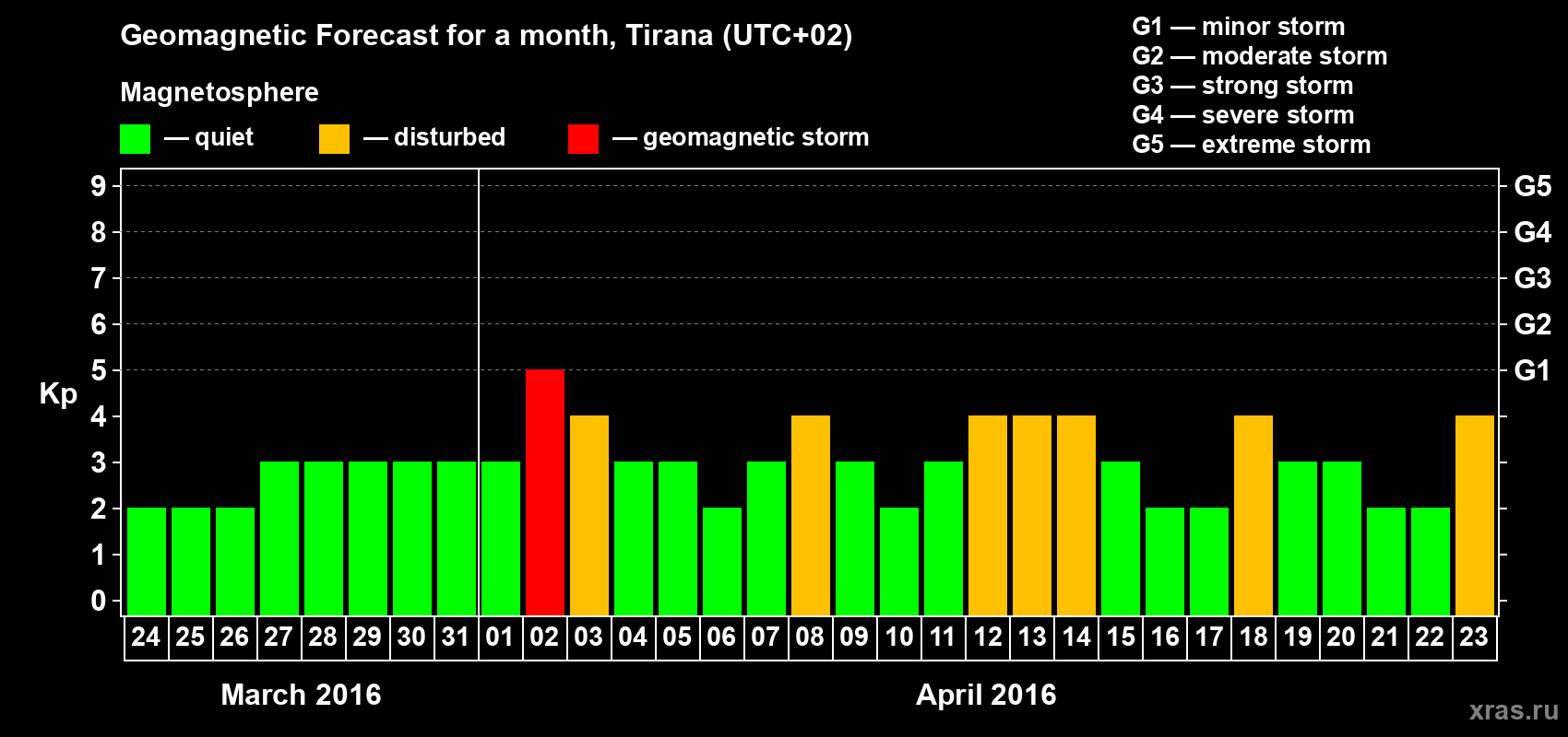 Geomagnetic storm forecast in Tirana for Mar 24, 2016
