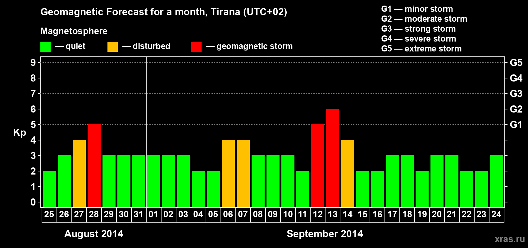 Geomagnetic storm forecast in Tirana for Aug 25, 2014