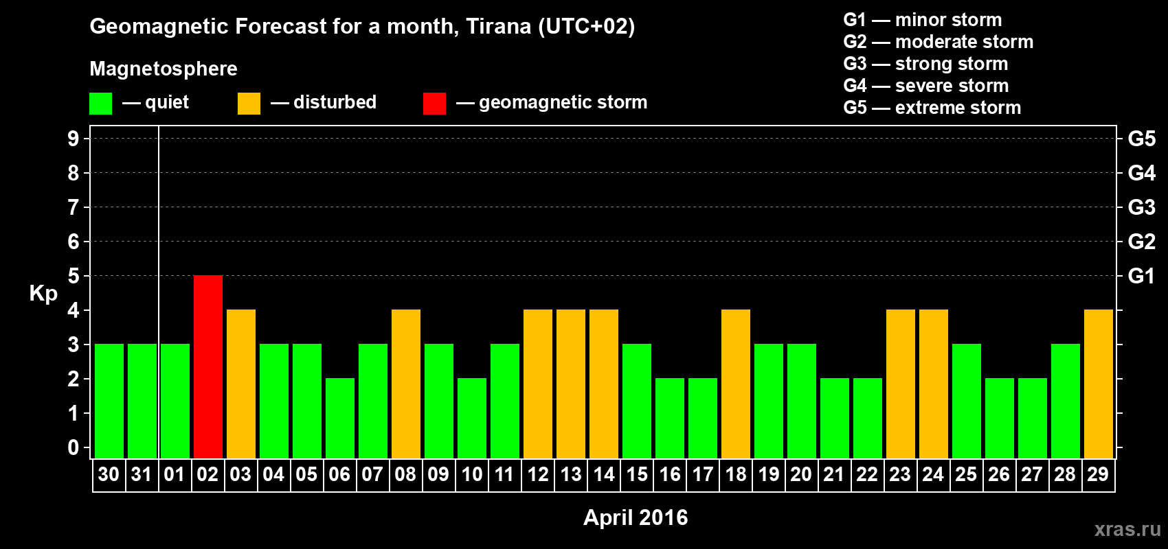 Geomagnetic storm forecast in Tirana for Mar 30, 2016