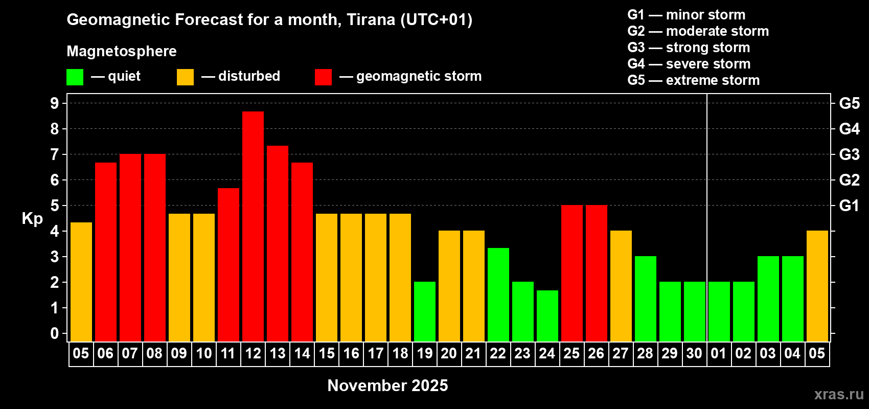 Geomagnetic storm forecast in Tirana for Nov 05, 2025