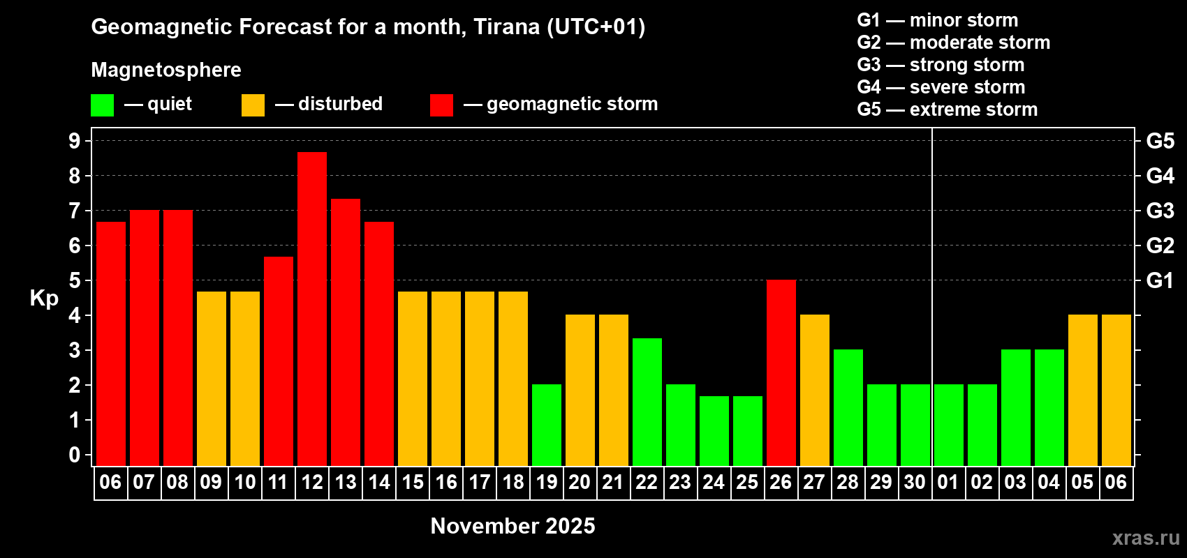 Geomagnetic storm forecast in Tirana for Nov 06, 2025