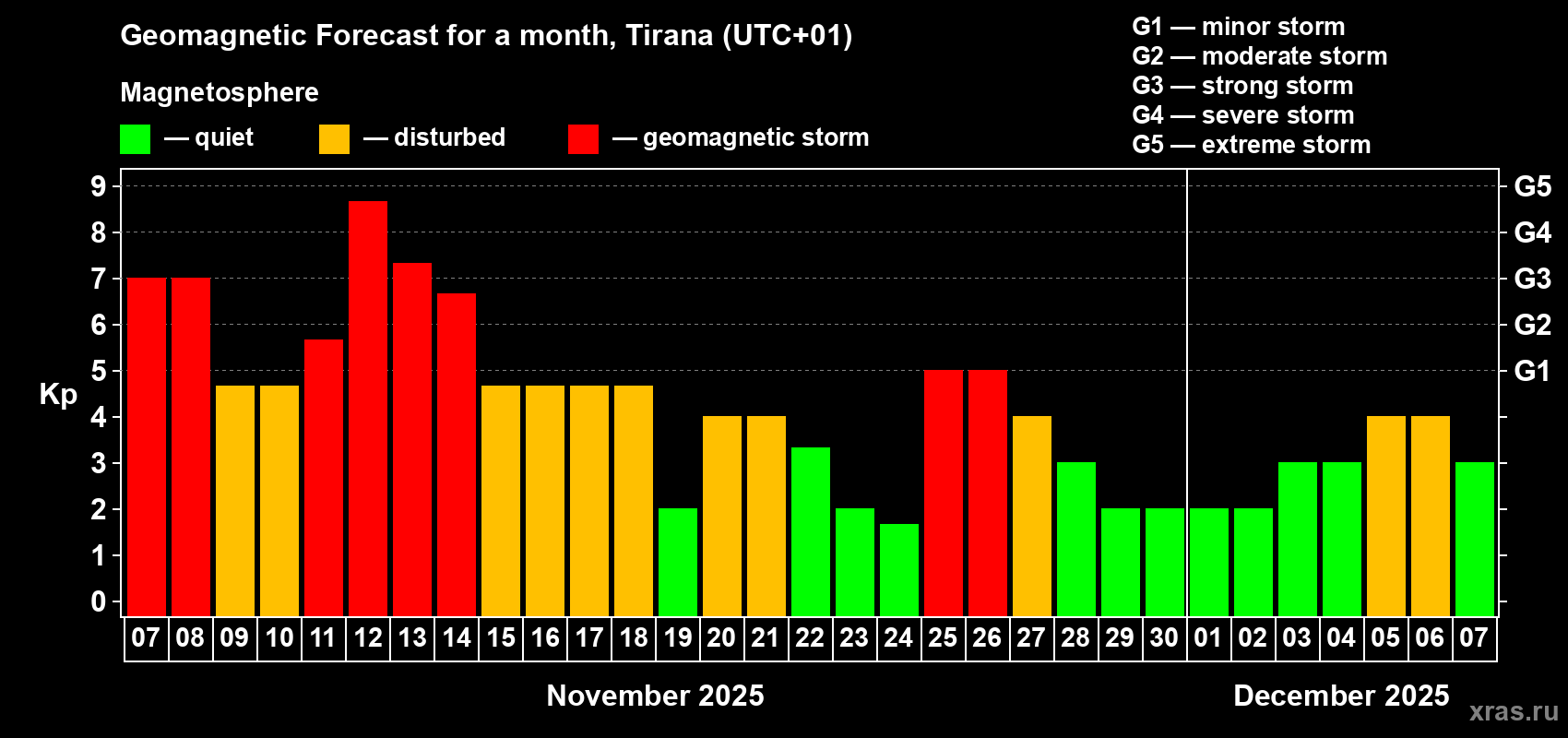 Geomagnetic storm forecast in Tirana for Nov 07, 2025