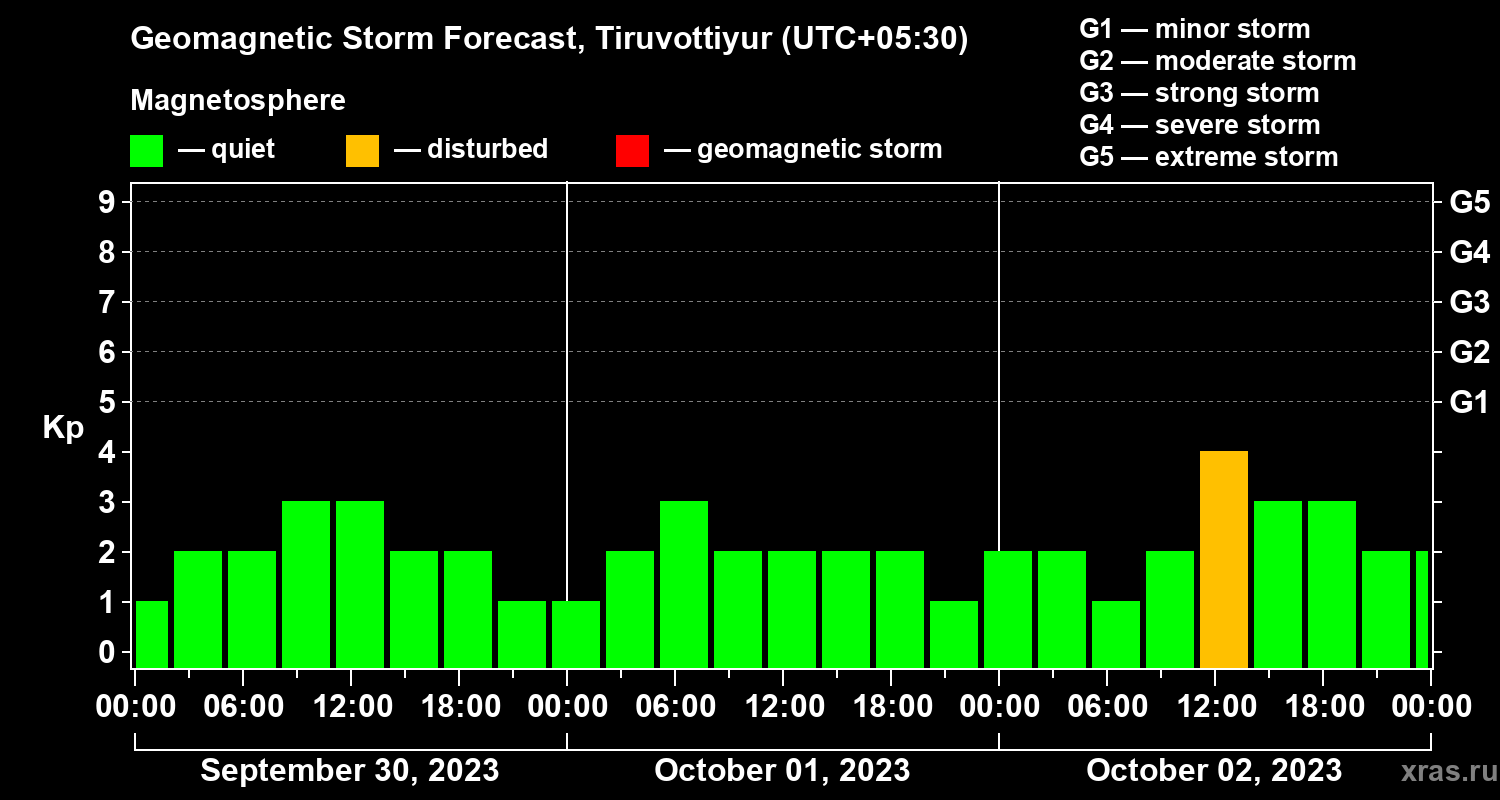 Geomagnetic storm forecast in Tiruvottiyur for Sep 30, 2023