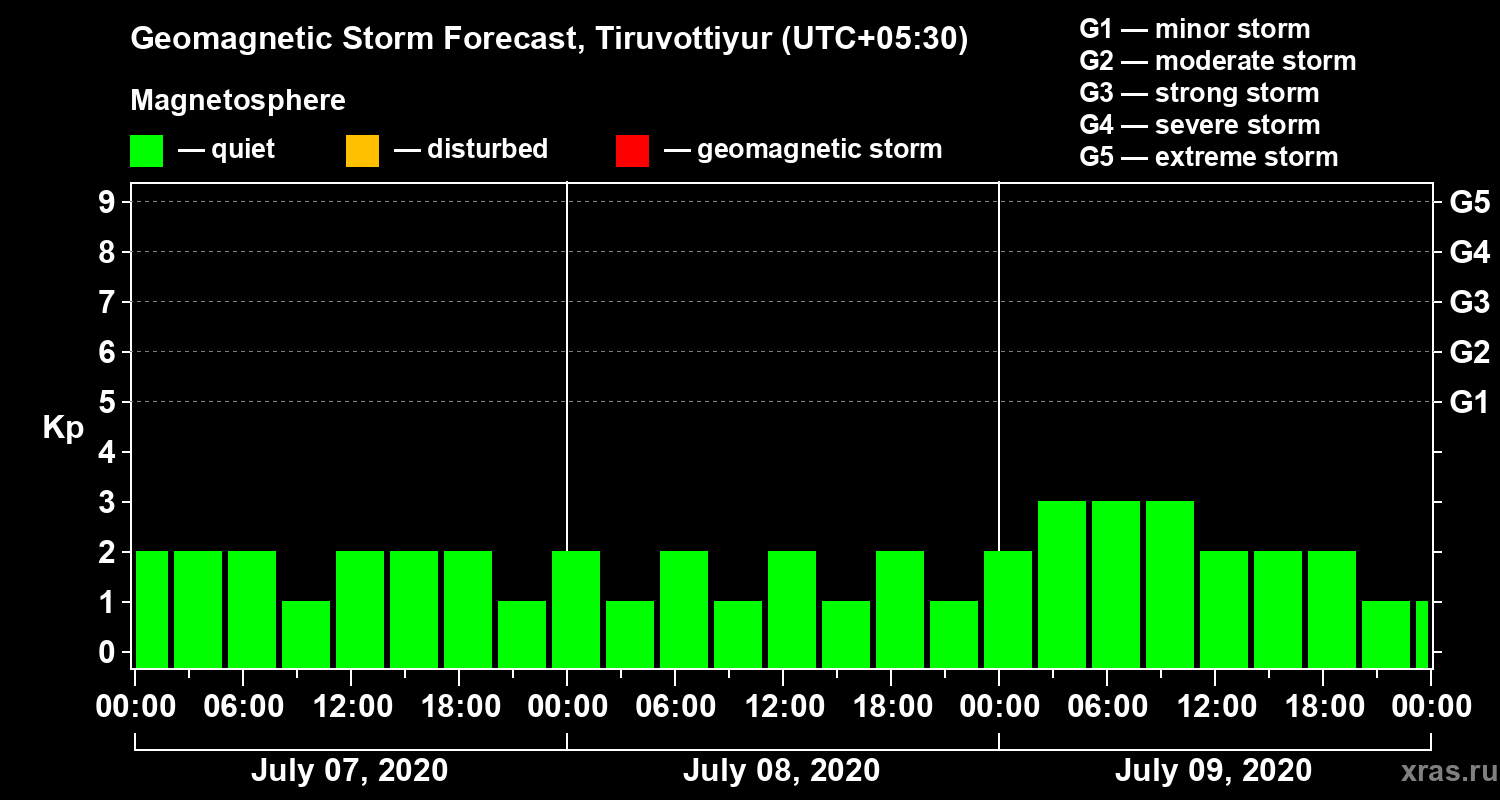 Geomagnetic storm forecast in Tiruvottiyur for Jul 07, 2020