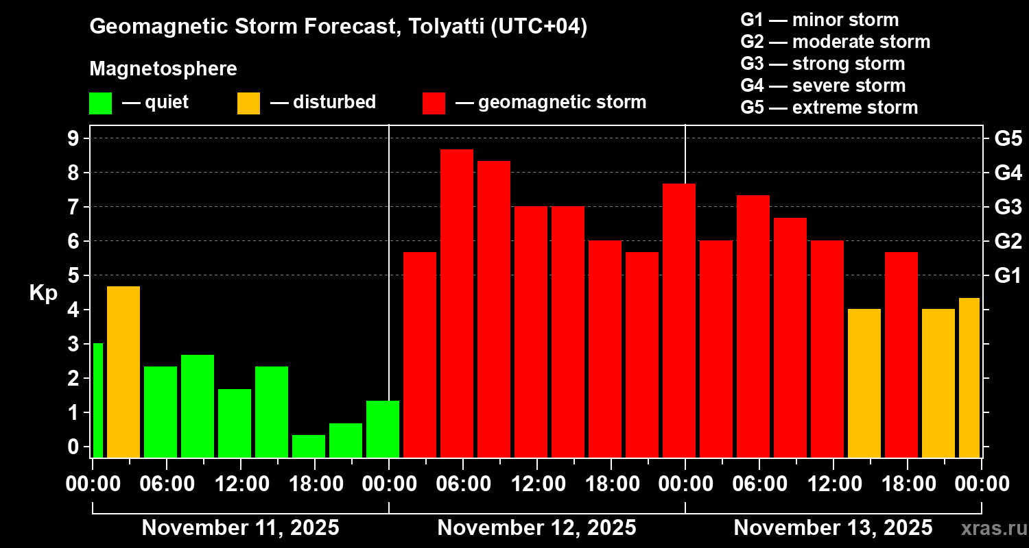 Geomagnetic storm forecast in Tolyatti for Nov 11, 2025