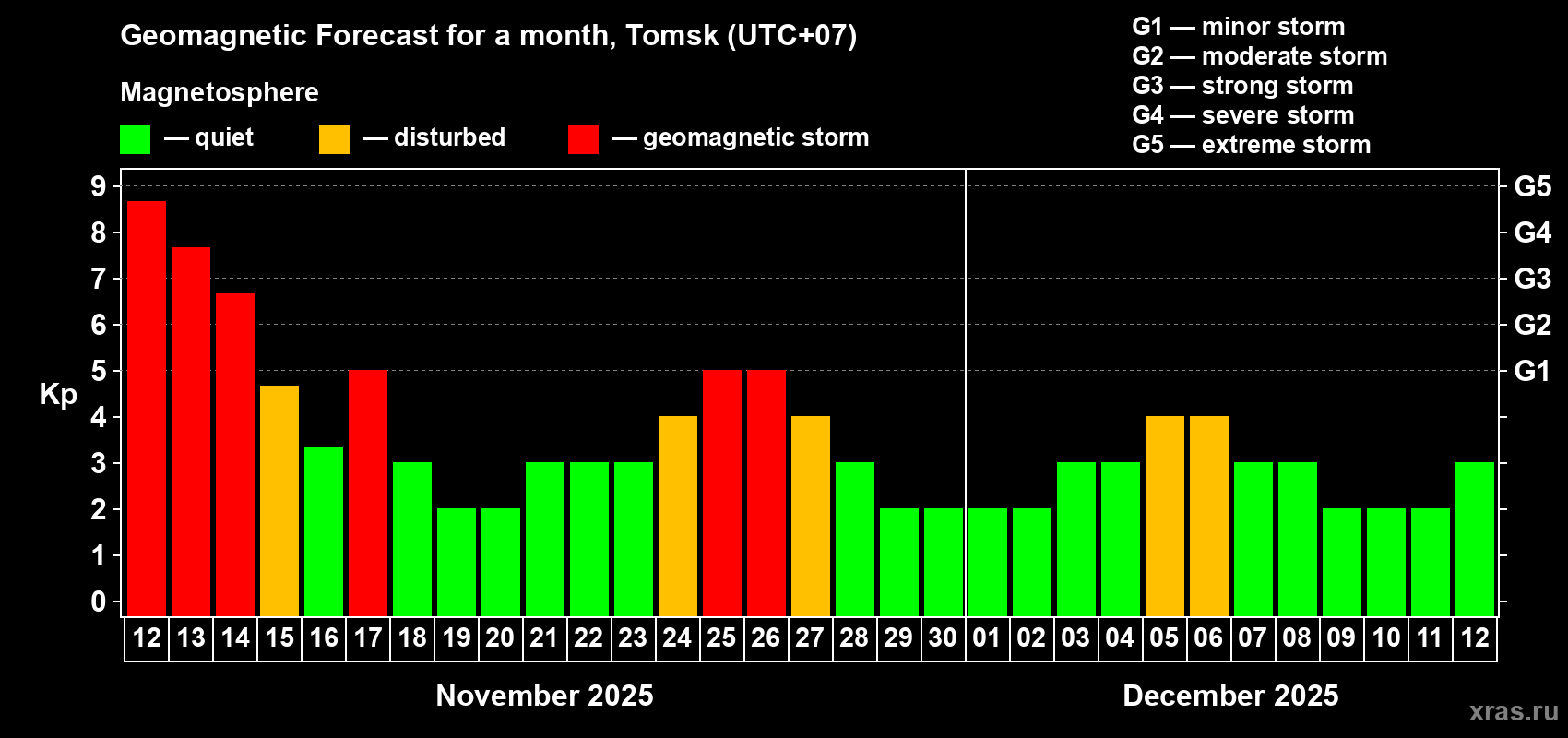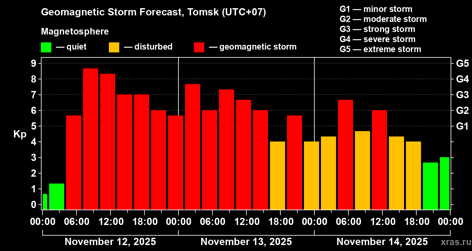 Geomagnetic storm forecast in Tomsk for Nov 12, 2025