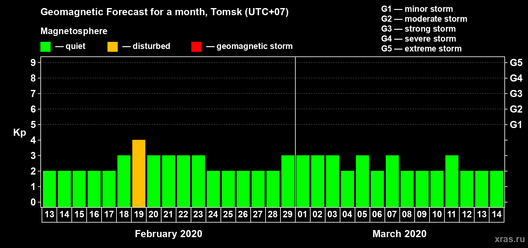 Geomagnetic activity forecast in Tomsk — Feb 13, 2020