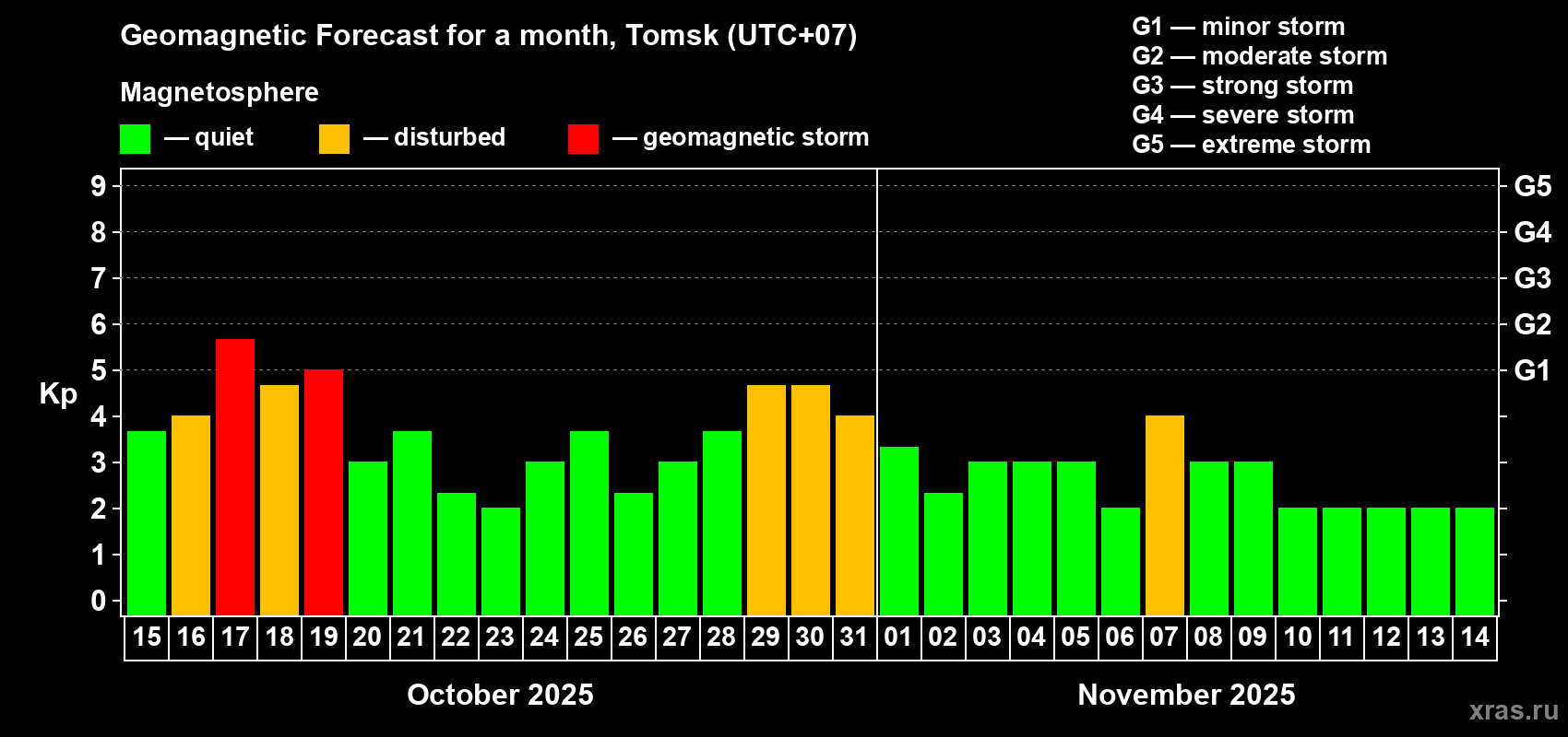 Geomagnetic storm forecast in Tomsk for Oct 15, 2025