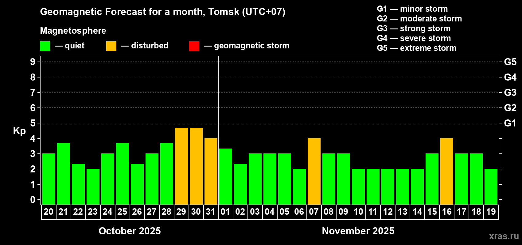 Geomagnetic storm forecast in Tomsk for Oct 20, 2025