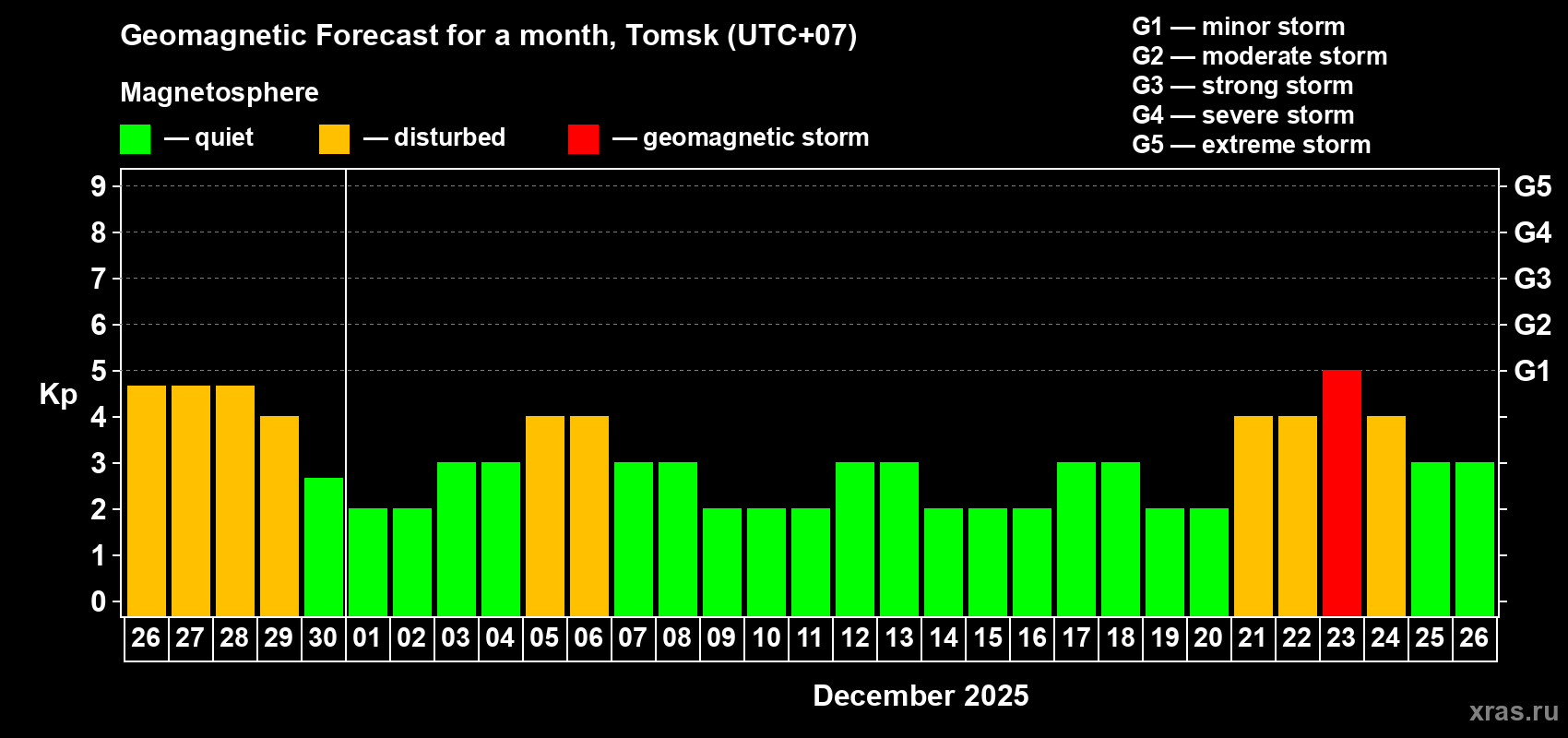 Geomagnetic storm forecast in Tomsk for Nov 26, 2025