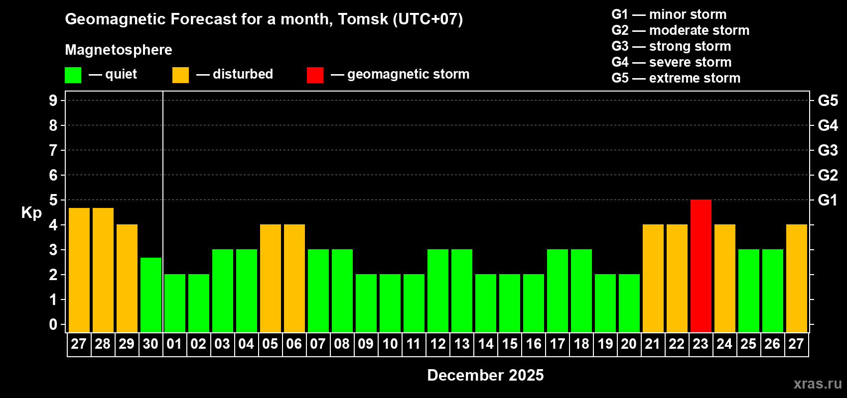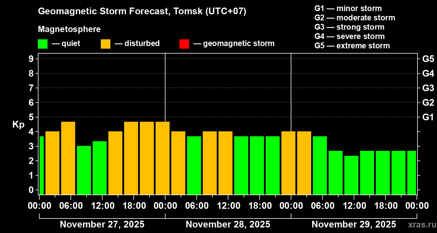 Geomagnetic storm forecast in Tomsk for Nov 27, 2025