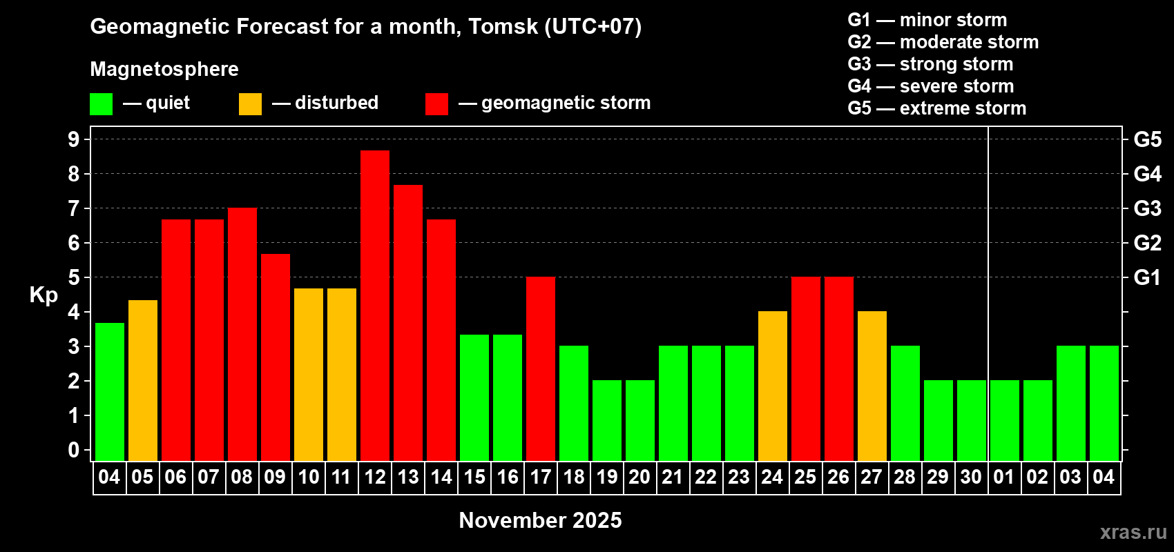 Geomagnetic storm forecast in Tomsk for Nov 04, 2025