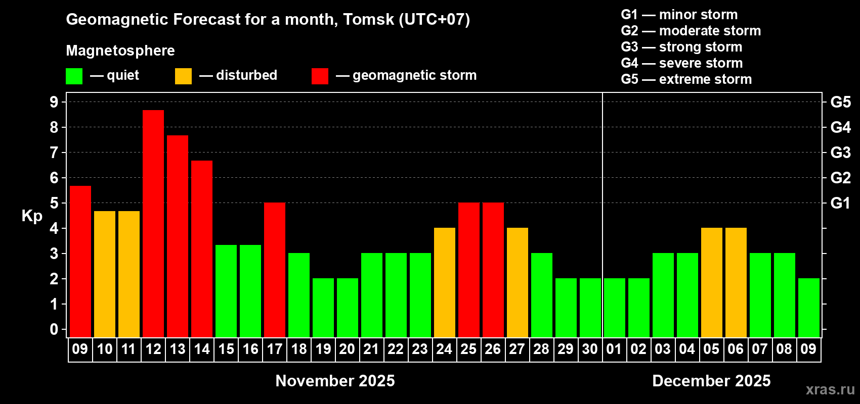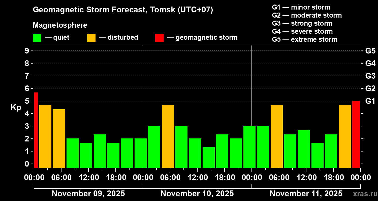 Geomagnetic storm forecast in Tomsk for Nov 09, 2025