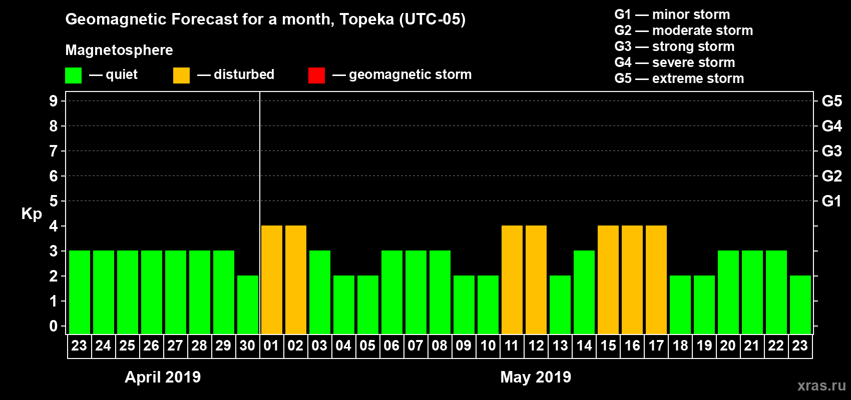 Geomagnetic storm forecast in Topeka for Apr 23, 2019