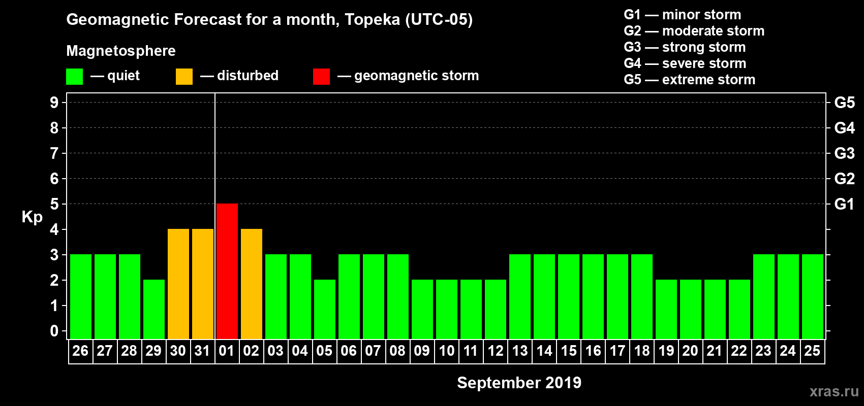 Geomagnetic storm forecast in Topeka for Aug 26, 2019