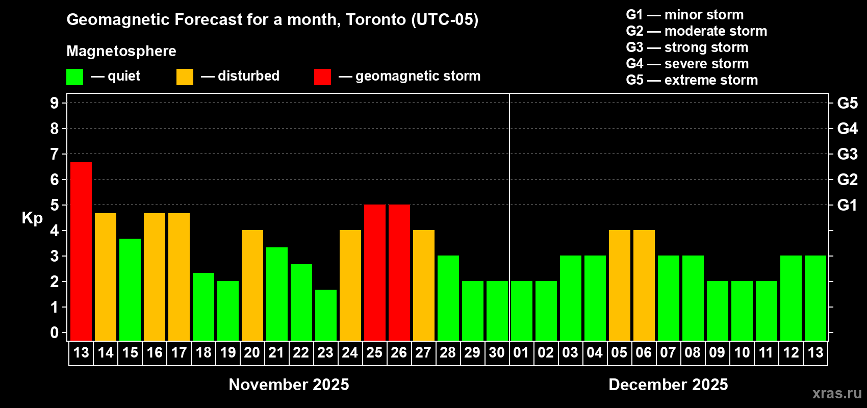 Geomagnetic storm forecast in Toronto for Nov 13, 2025
