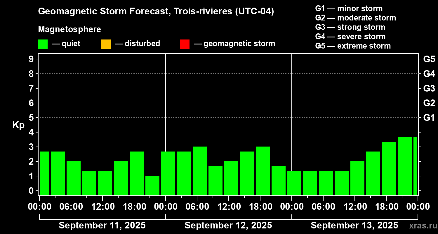 Geomagnetic storm forecast in Trois-rivieres for Sep 11, 2025