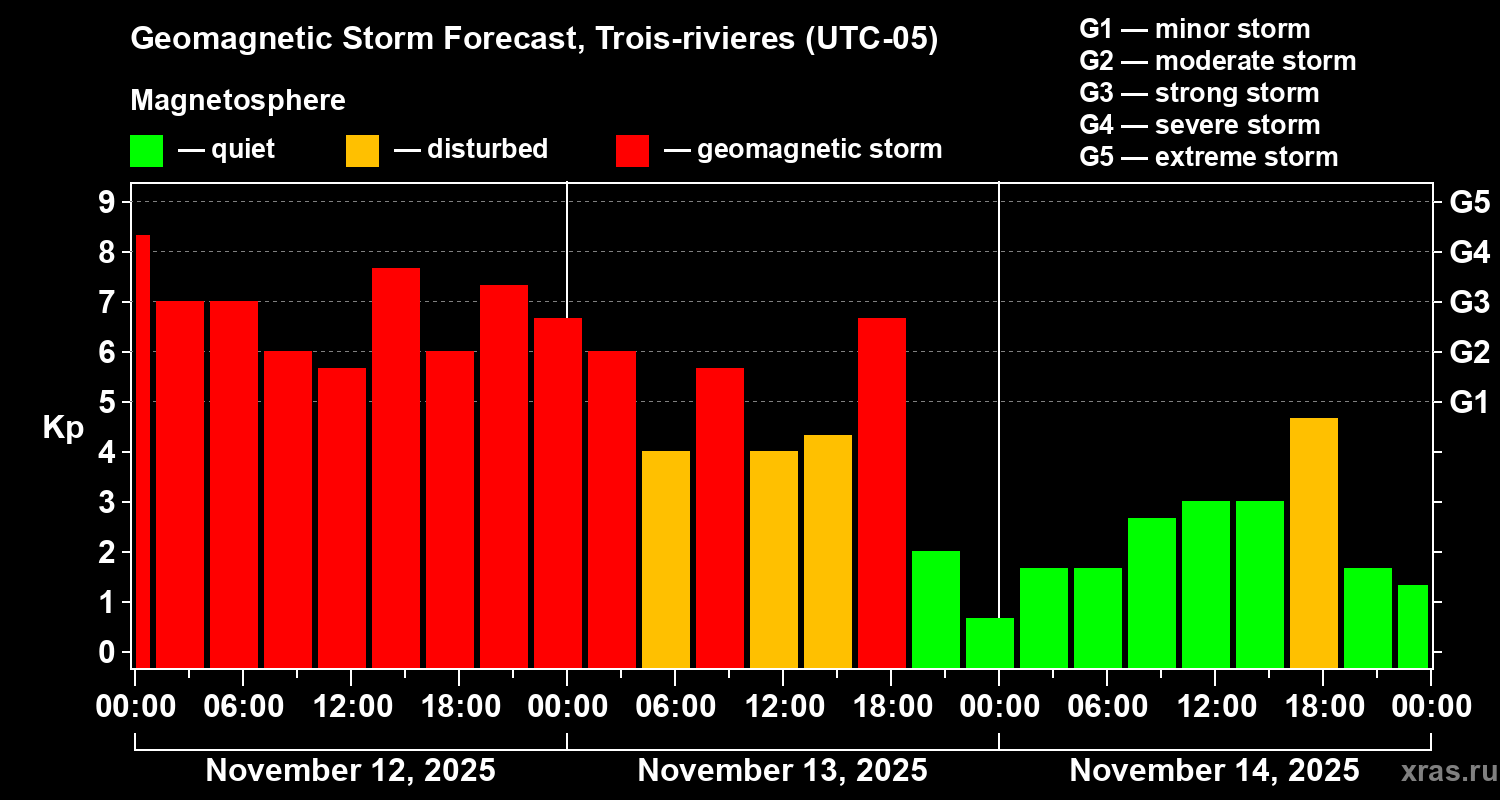 Geomagnetic storm forecast in Trois-rivieres for Nov 12, 2025