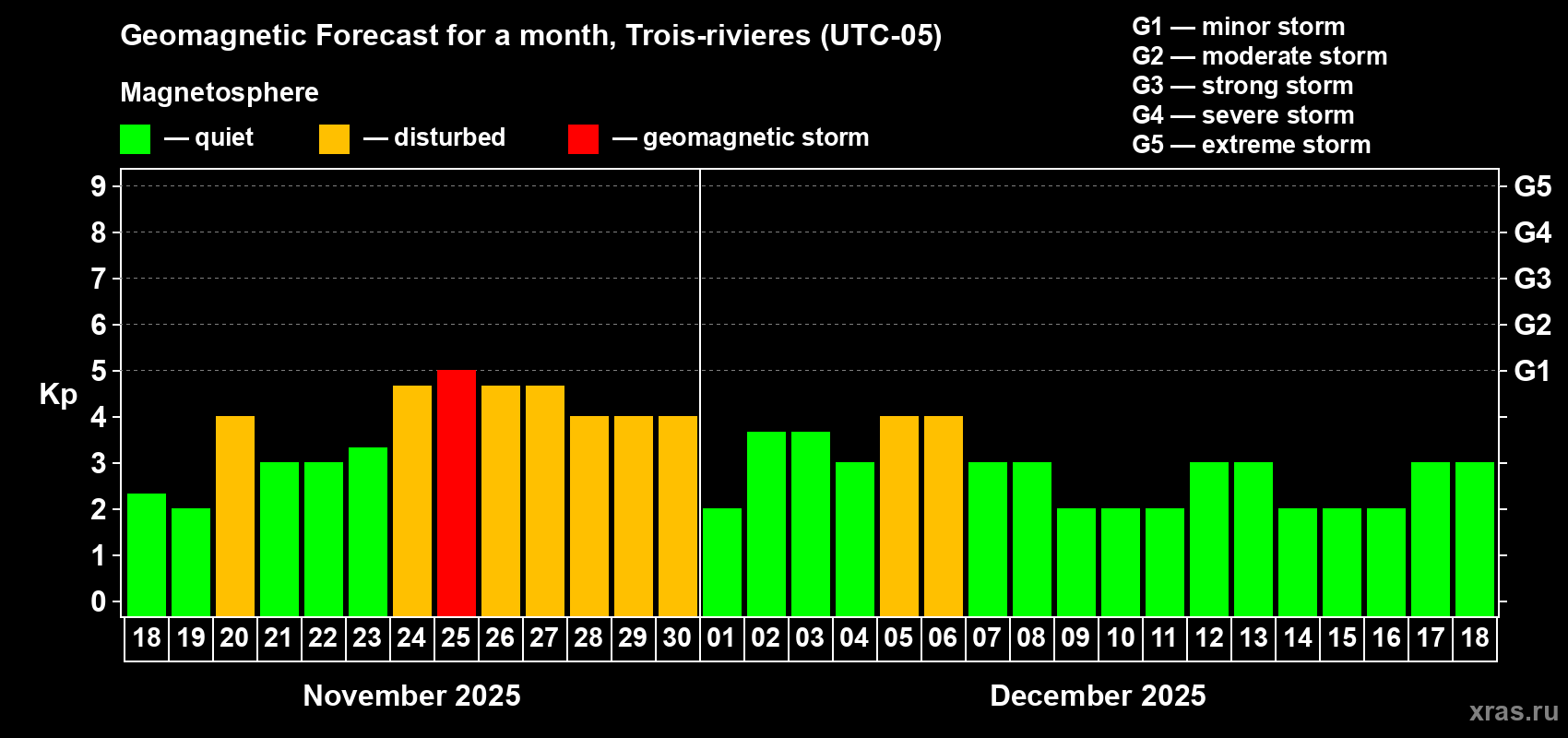 Geomagnetic storm forecast in Trois-rivieres for Nov 18, 2025