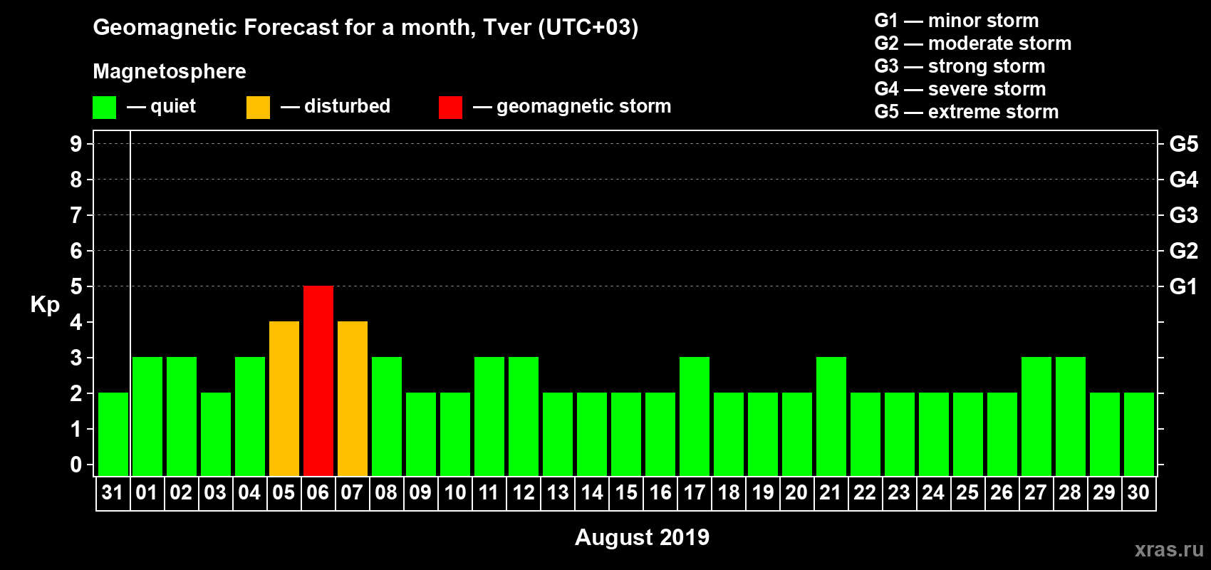 Geomagnetic storm forecast in Tver for Jul 31, 2019