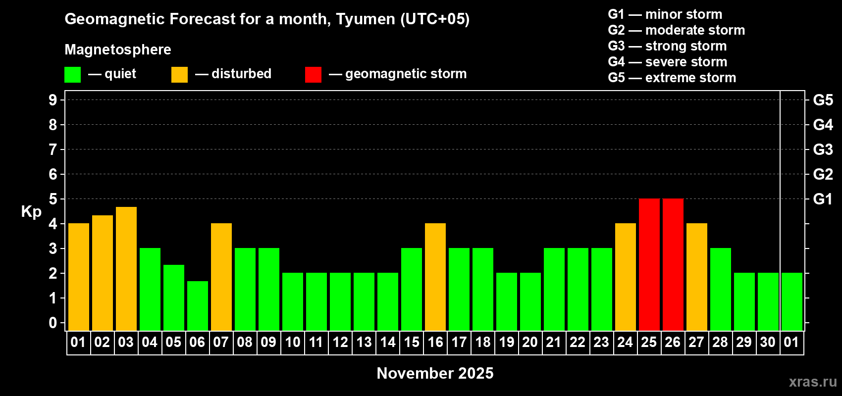 Geomagnetic storm forecast in Tyumen for Nov 01, 2025