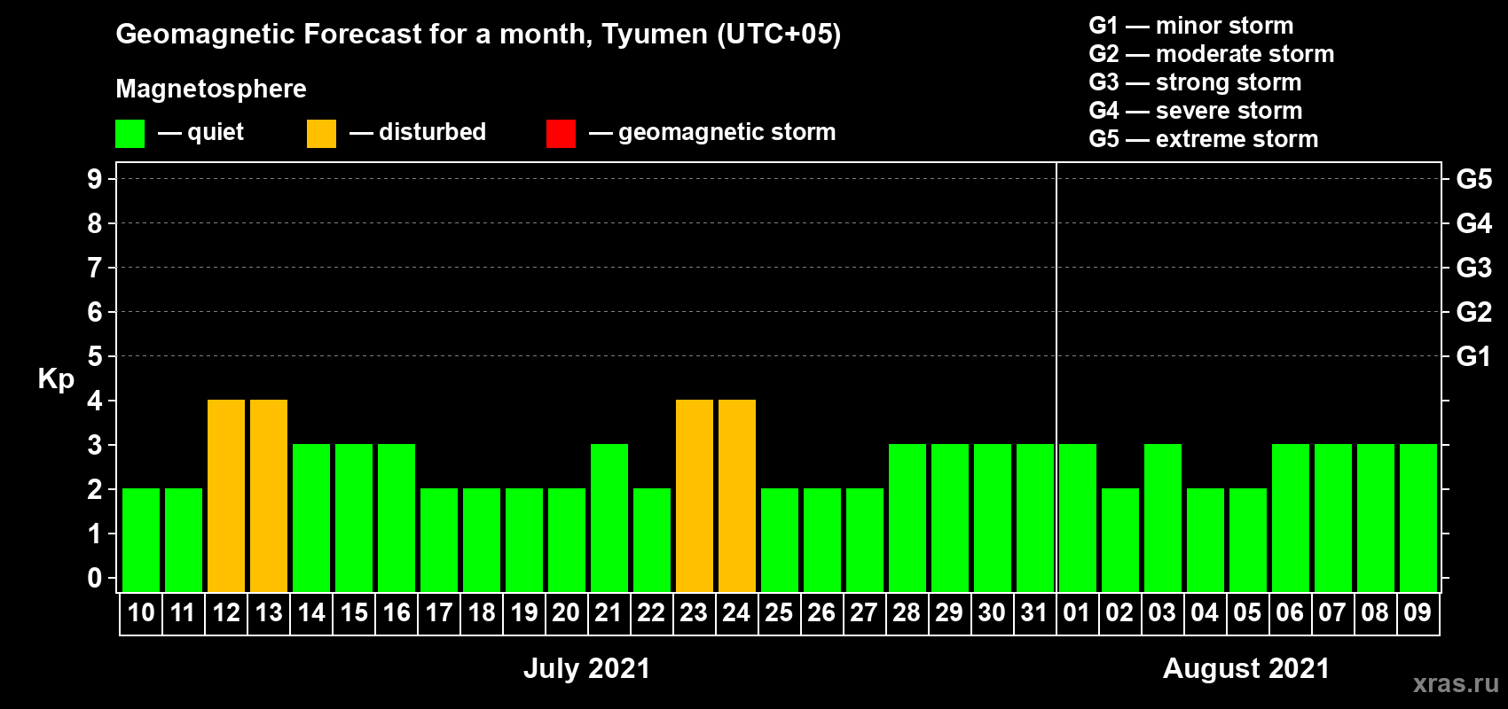 Geomagnetic activity forecast in Tyumen — Jul 10, 2021