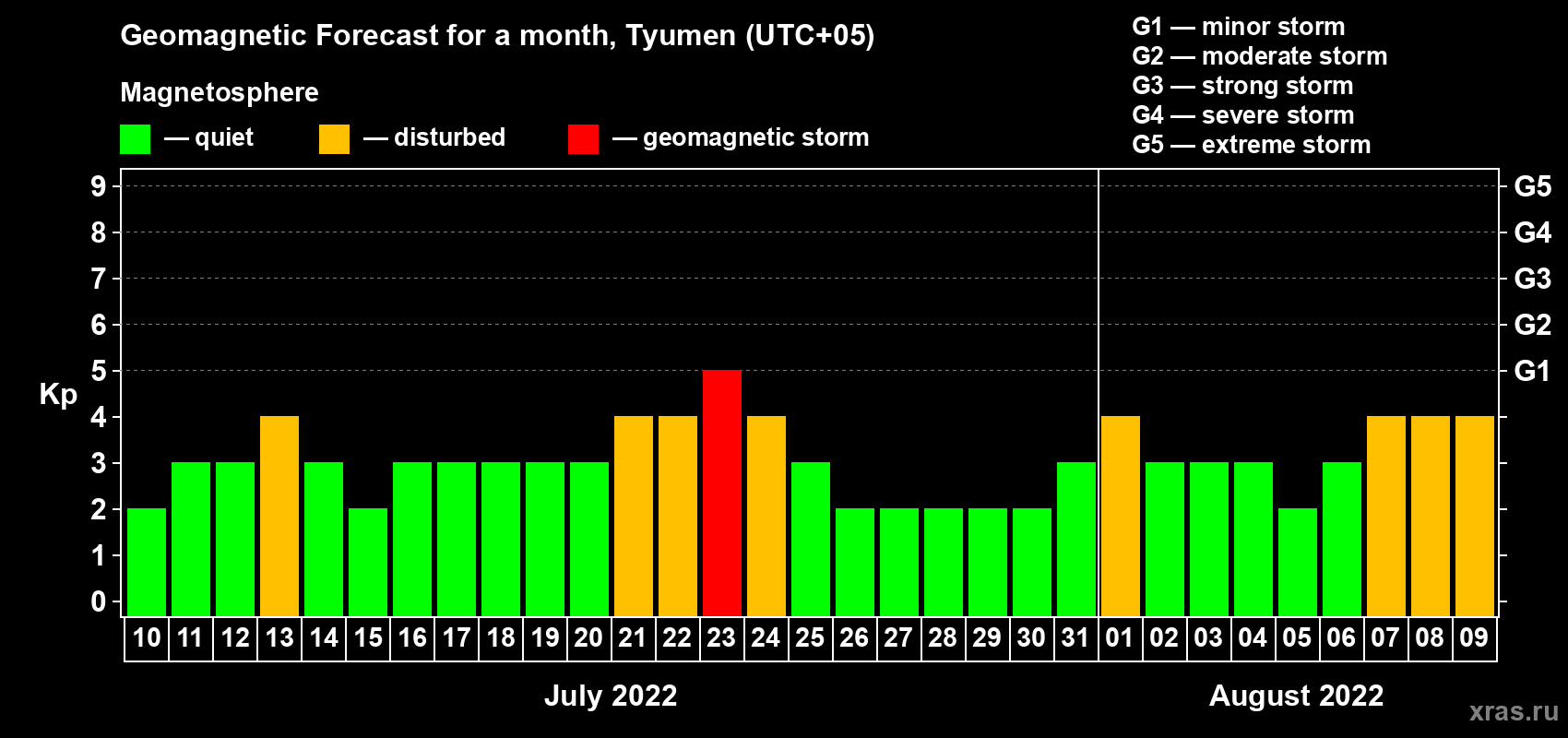 Geomagnetic activity forecast in Tyumen — Jul 10, 2022