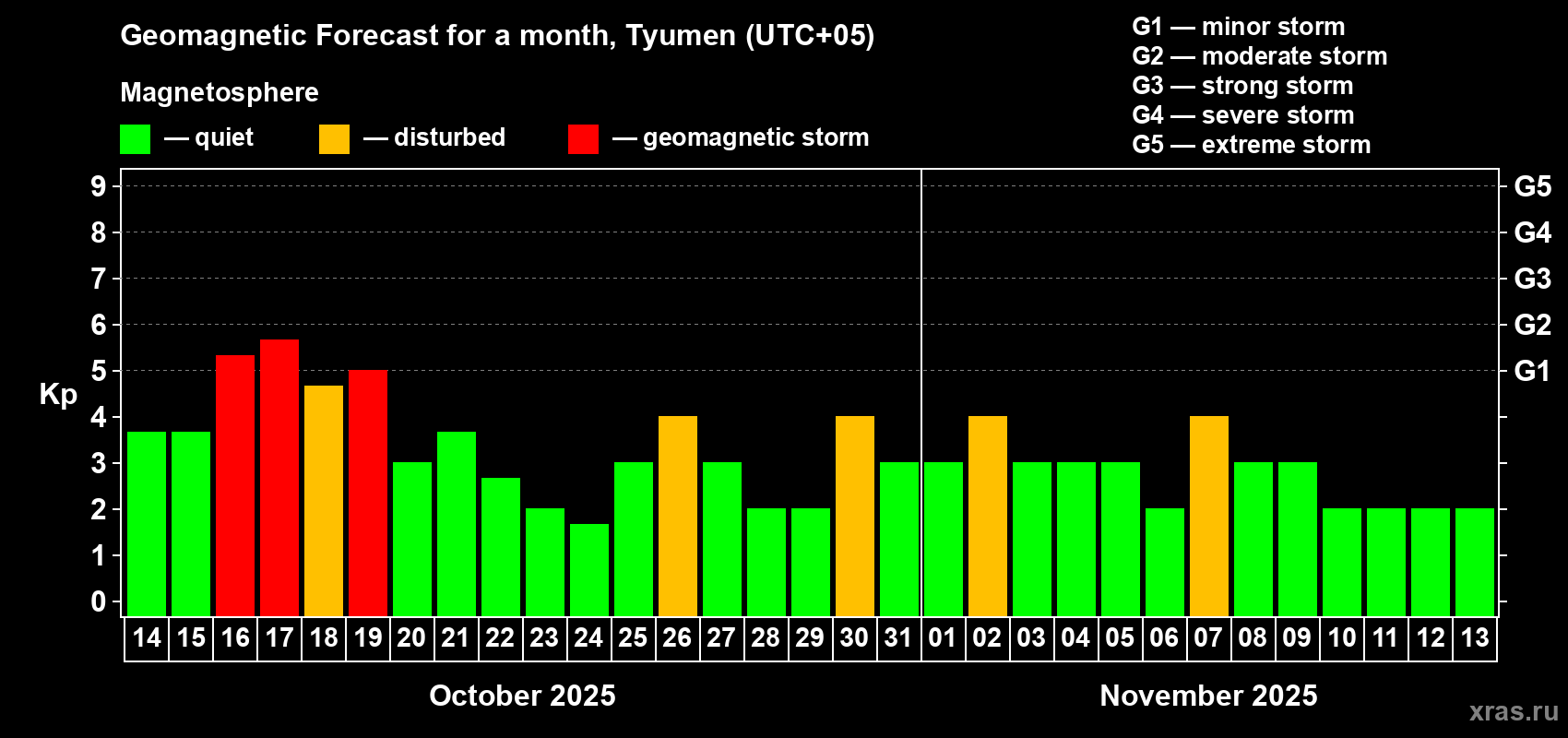 Geomagnetic storm forecast in Tyumen for Oct 14, 2025