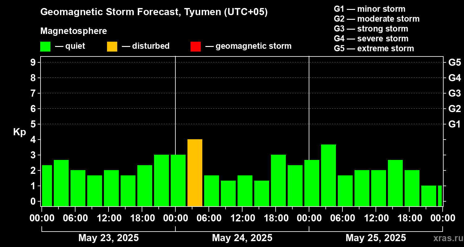 Geomagnetic activity forecast in Tyumen — May 23, 2025