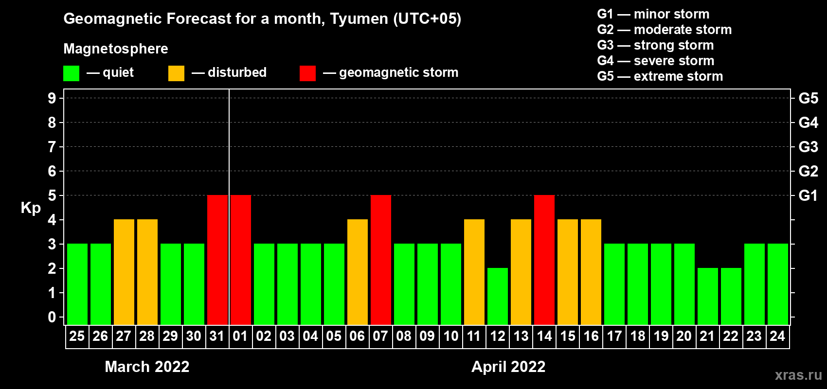 Geomagnetic storm forecast in Tyumen for Mar 25, 2022