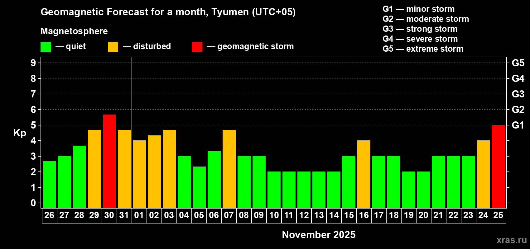 Geomagnetic storm forecast in Tyumen for Oct 26, 2025