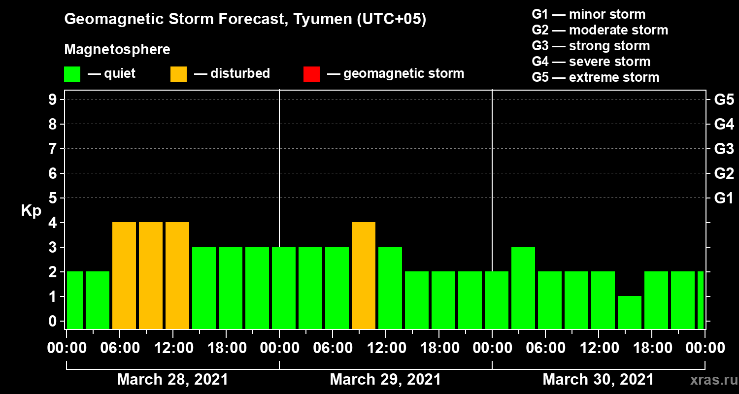 Geomagnetic storm forecast in Tyumen for Mar 28, 2021