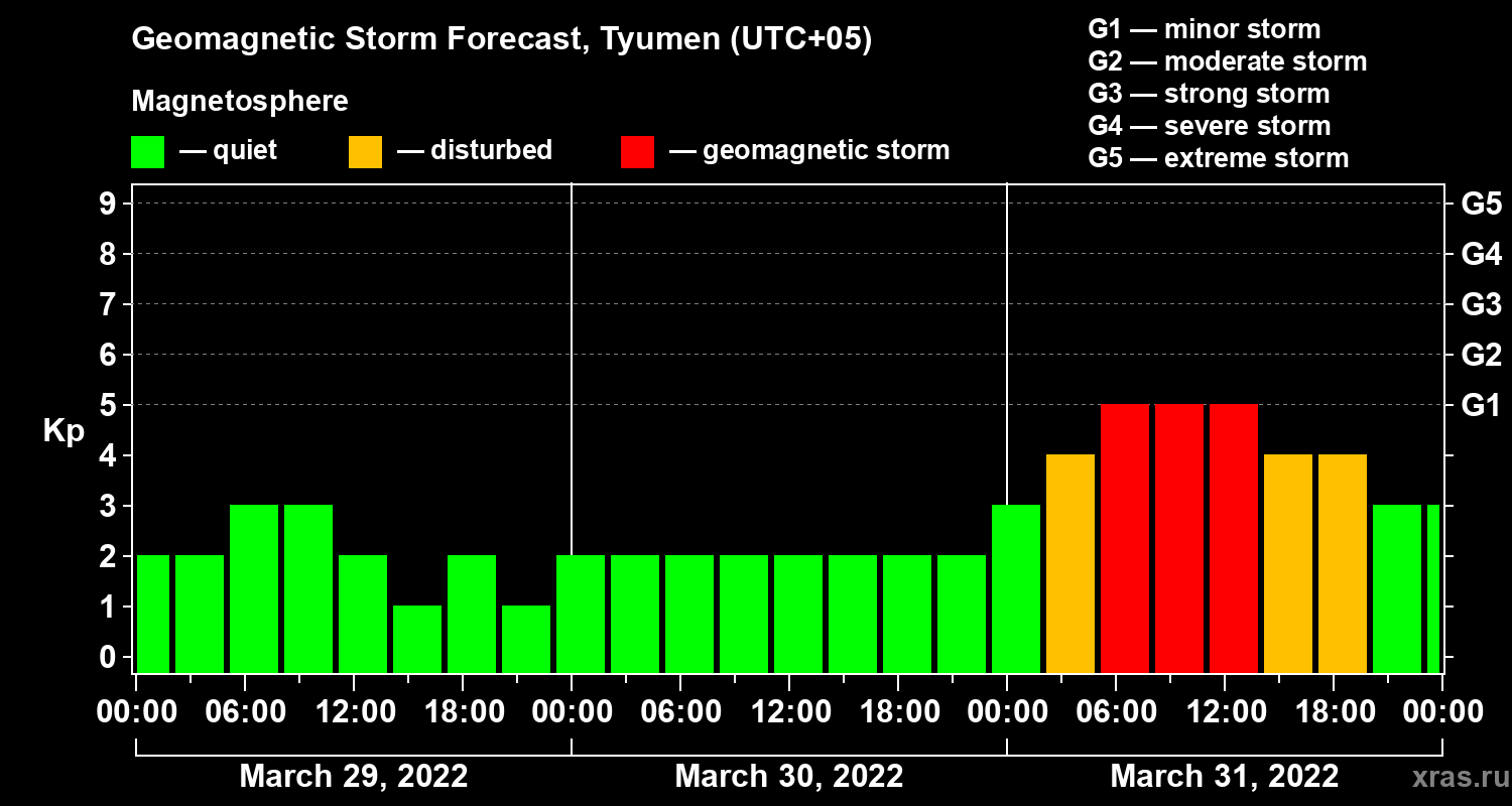 Geomagnetic storm forecast in Tyumen for Mar 29, 2022
