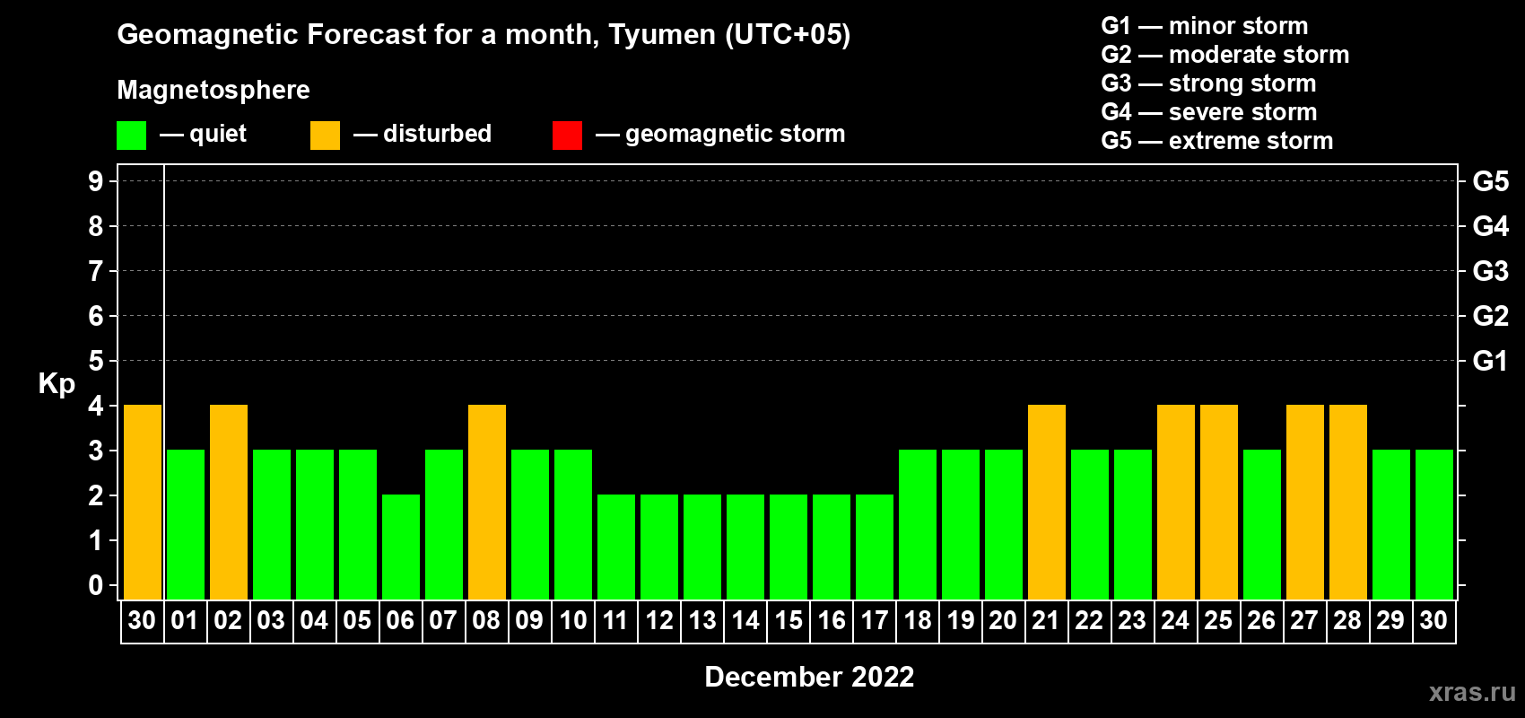 Geomagnetic activity forecast in Tyumen — Nov 30, 2022