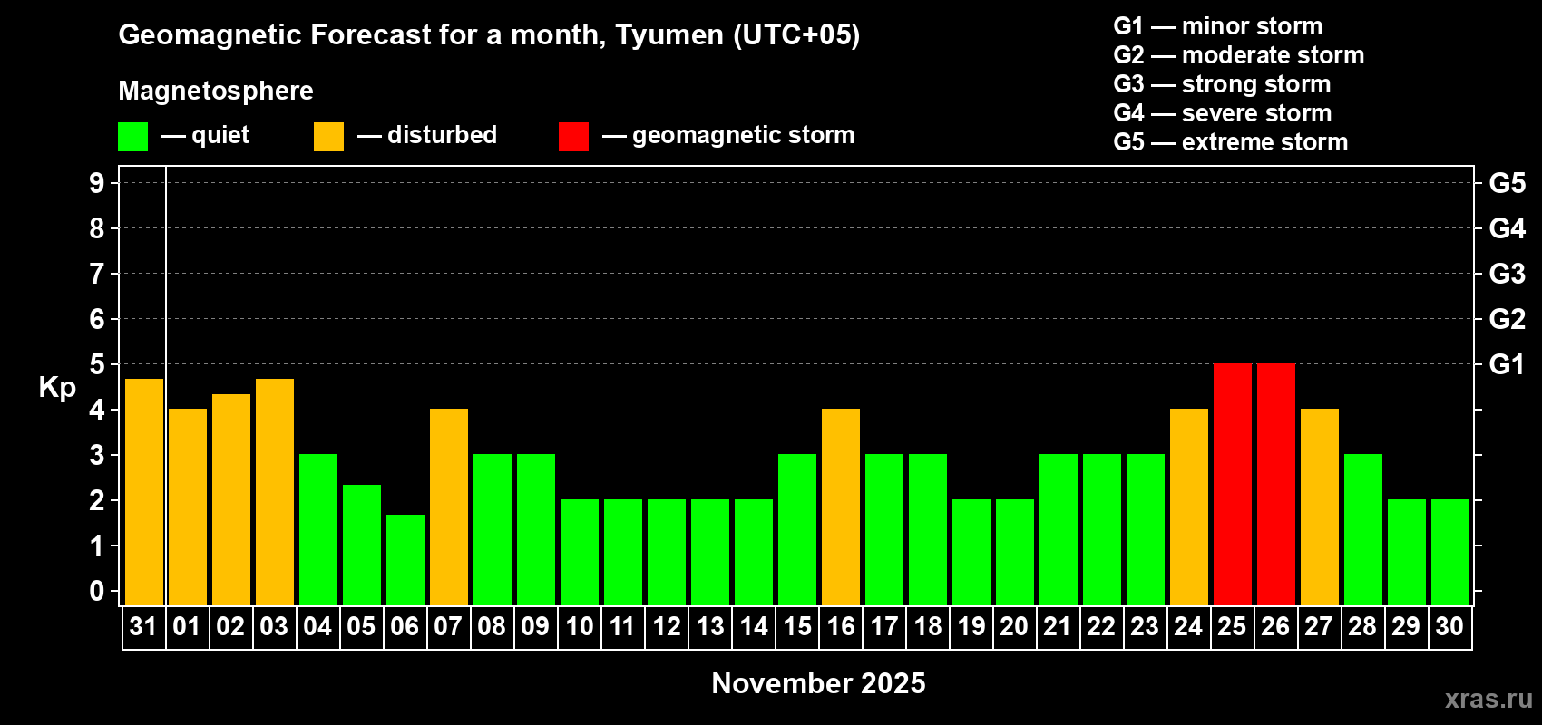 Geomagnetic storm forecast in Tyumen for Oct 31, 2025
