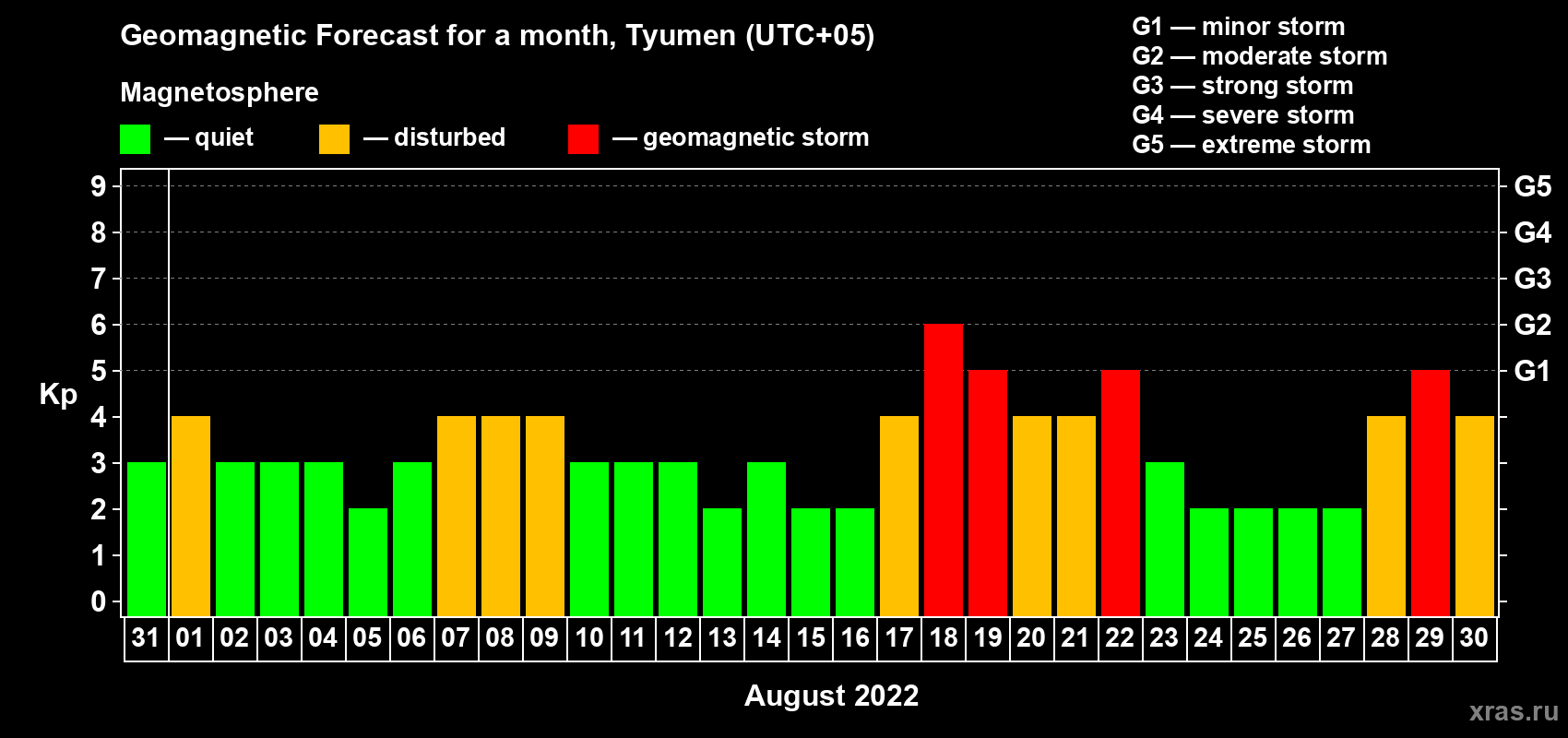 Geomagnetic activity forecast in Tyumen — Jul 31, 2022