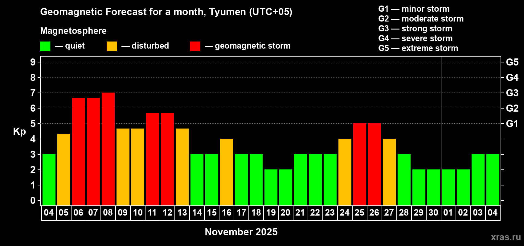 Geomagnetic storm forecast in Tyumen for Nov 04, 2025