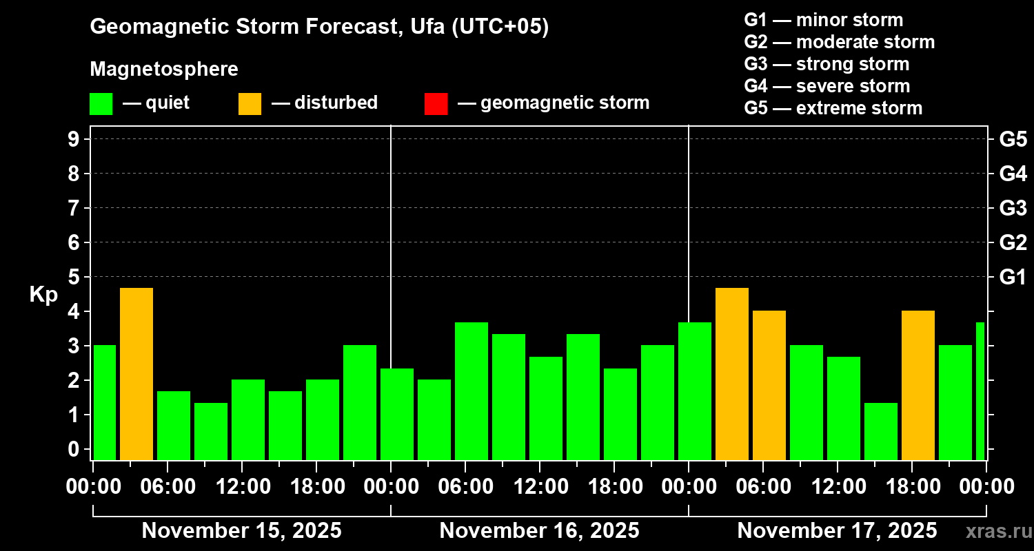Geomagnetic storm forecast in Ufa for Nov 15, 2025