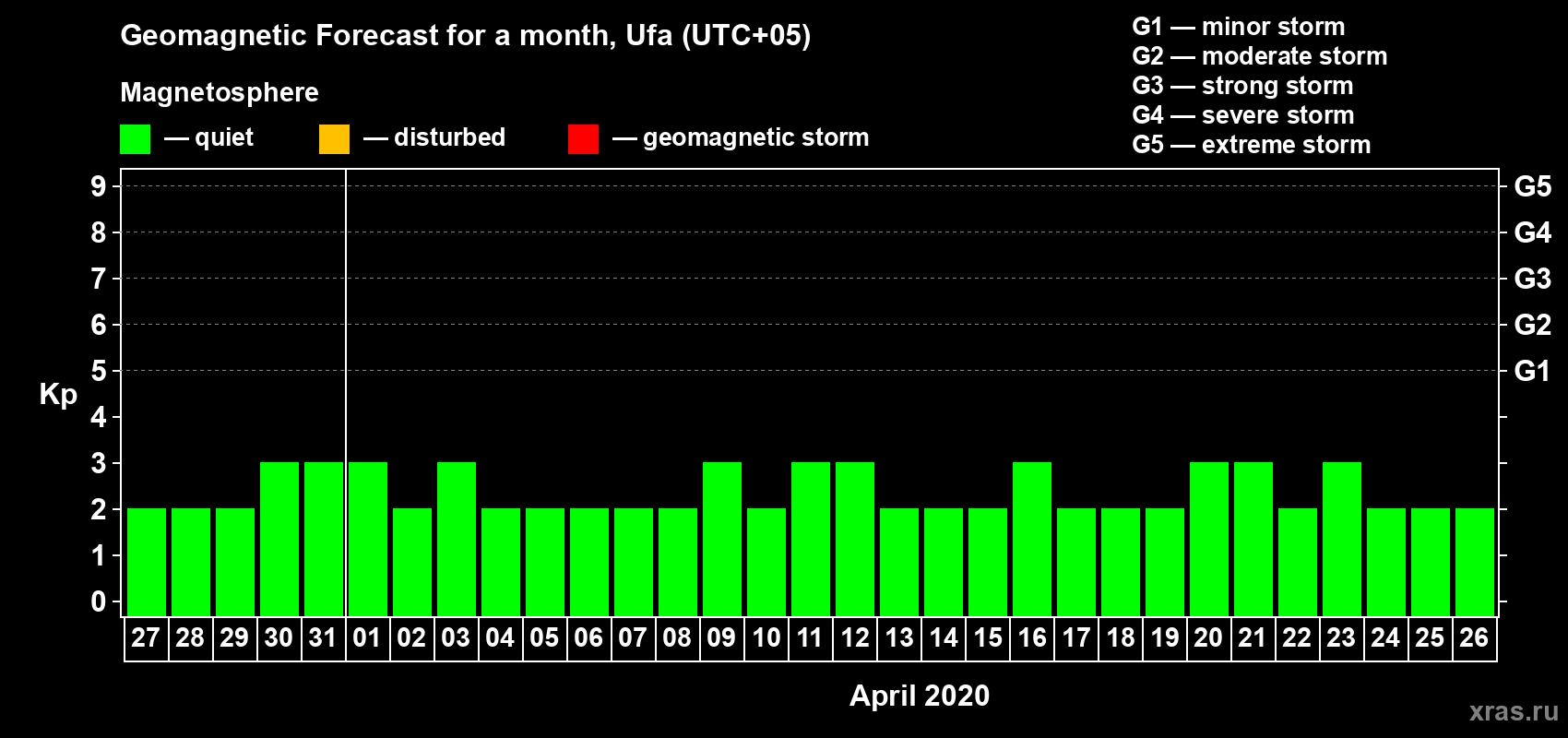Geomagnetic storm forecast in Ufa for Mar 27, 2020