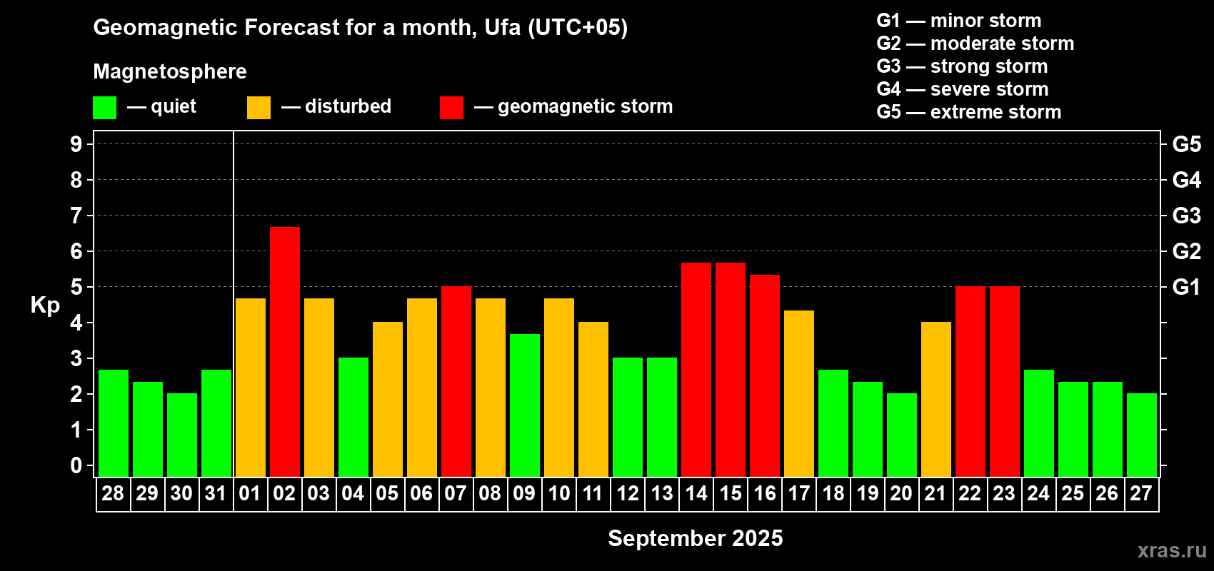 Geomagnetic storm forecast in Ufa for Aug 28, 2025