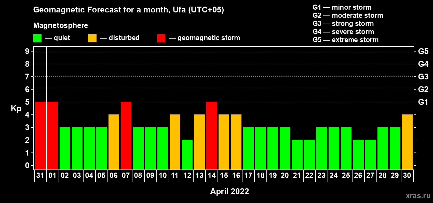 Geomagnetic activity forecast in Ufa — Mar 31, 2022