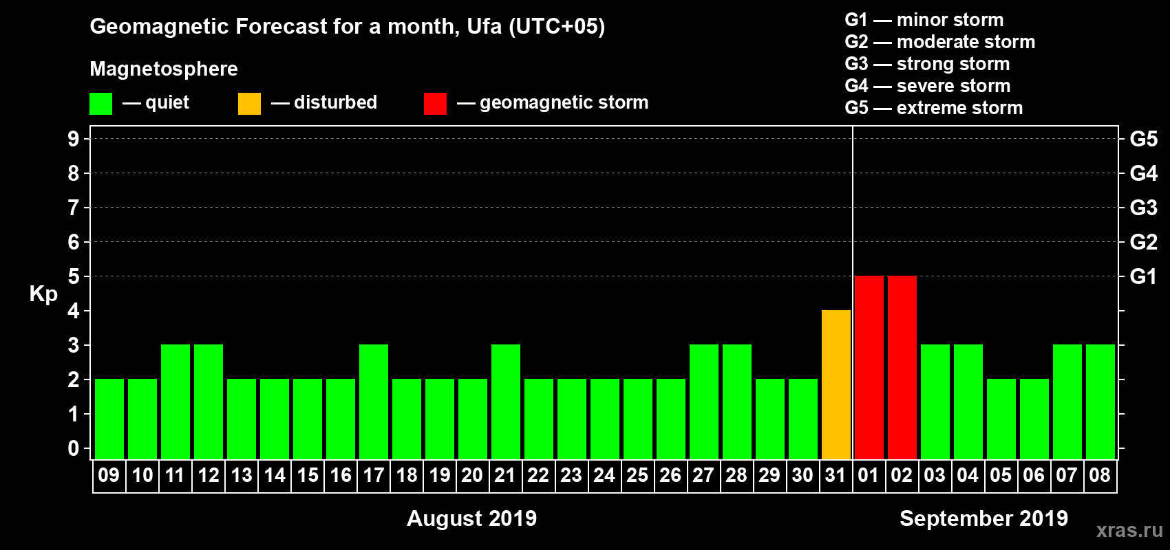 Geomagnetic activity forecast in Ufa — Aug 09, 2019