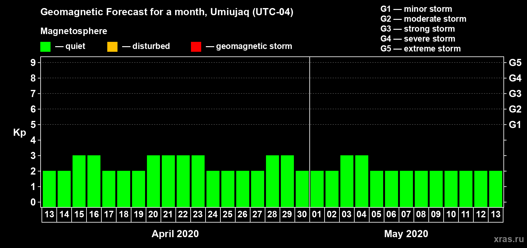Geomagnetic storm forecast in Umiujaq for Apr 13, 2020