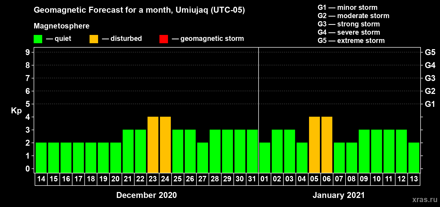 Geomagnetic storm forecast in Umiujaq for Dec 14, 2020