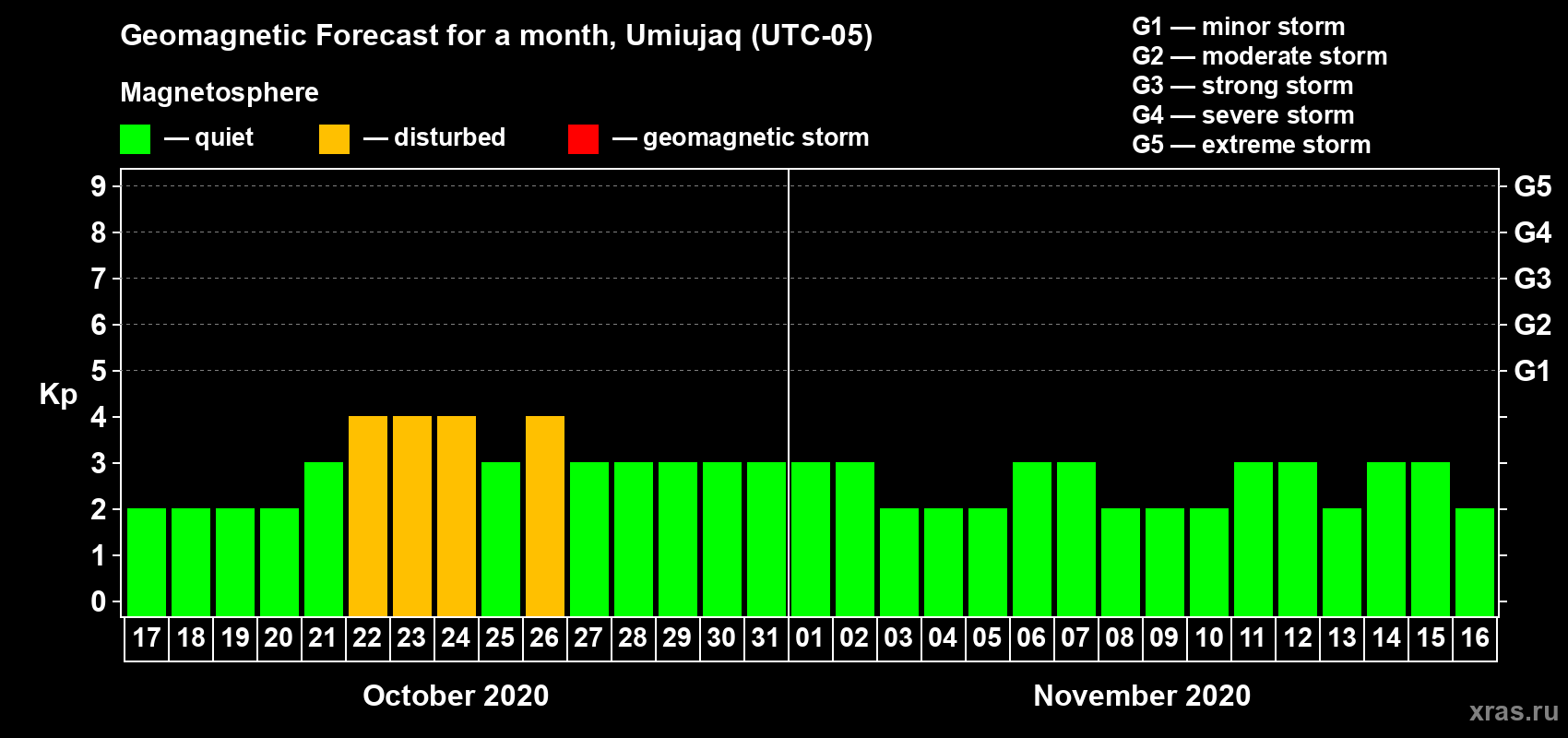 Geomagnetic storm forecast in Umiujaq for Oct 17, 2020