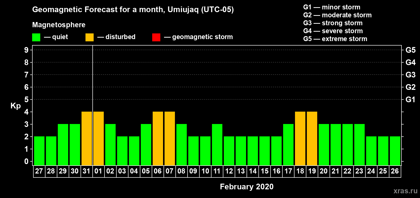 Geomagnetic storm forecast in Umiujaq for Jan 27, 2020