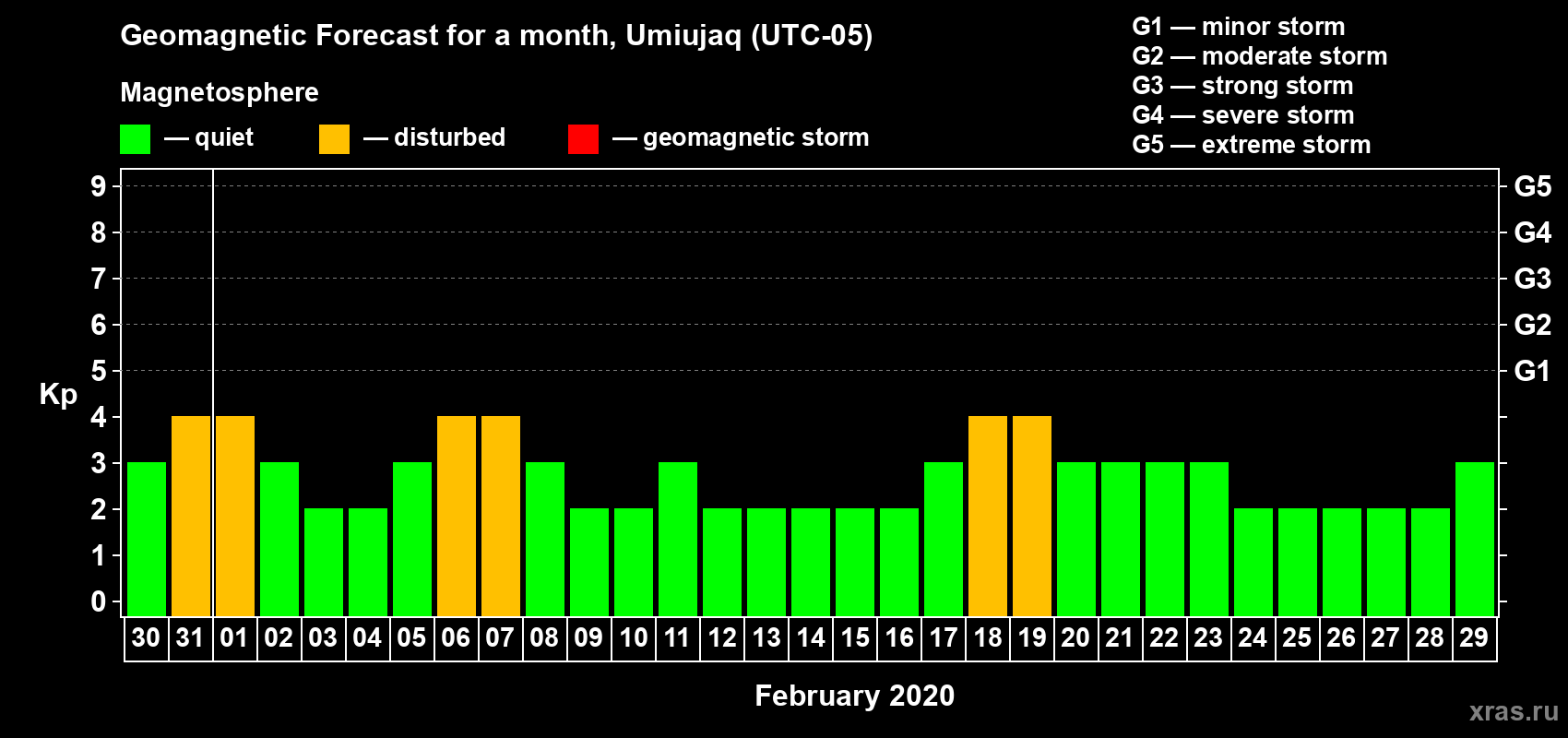 Geomagnetic activity forecast in Umiujaq — Jan 30, 2020